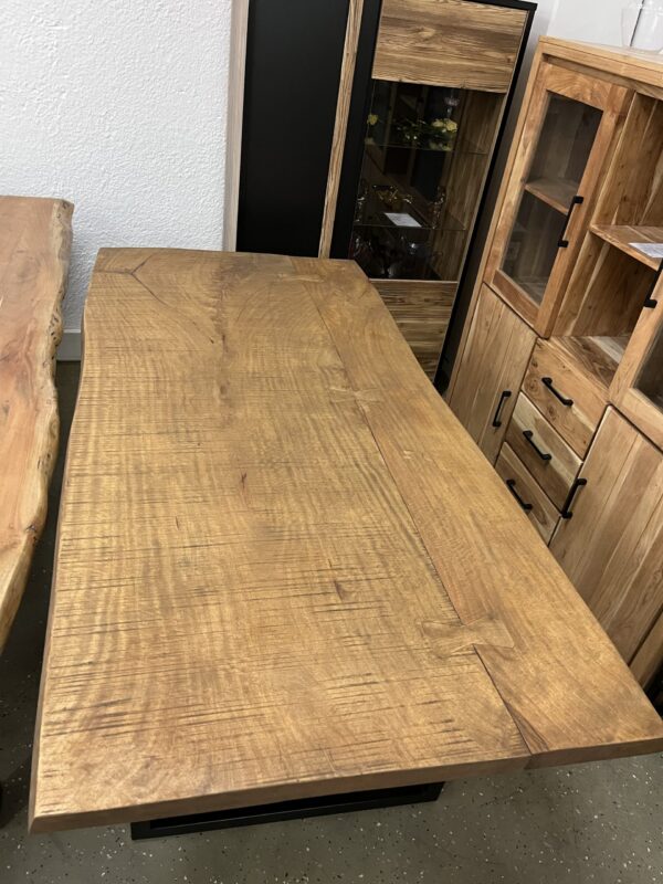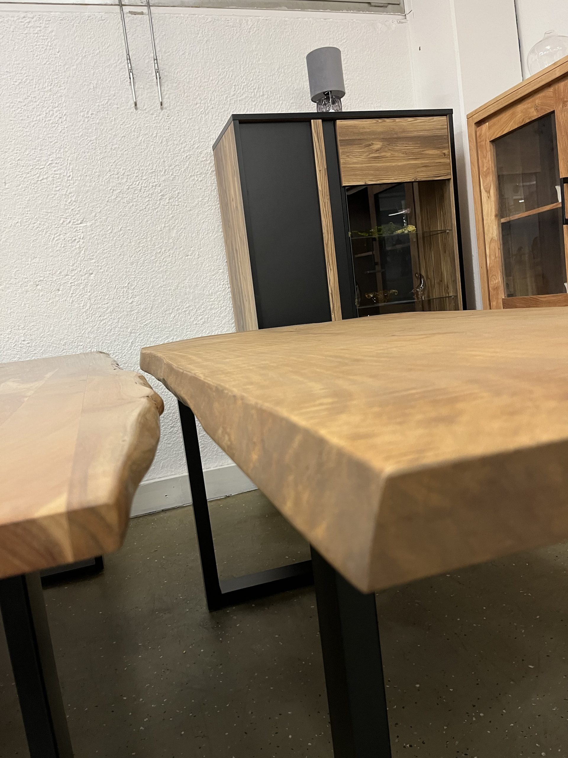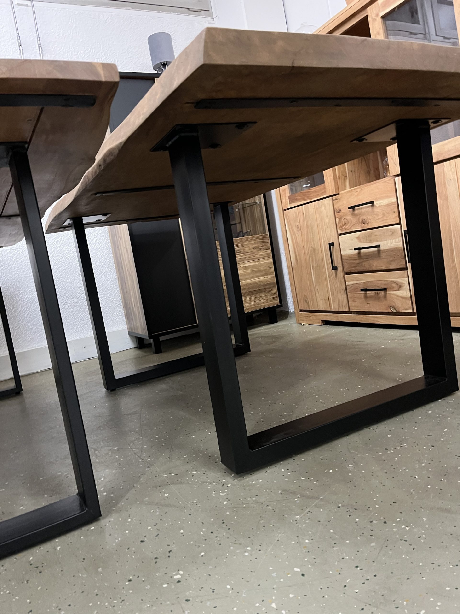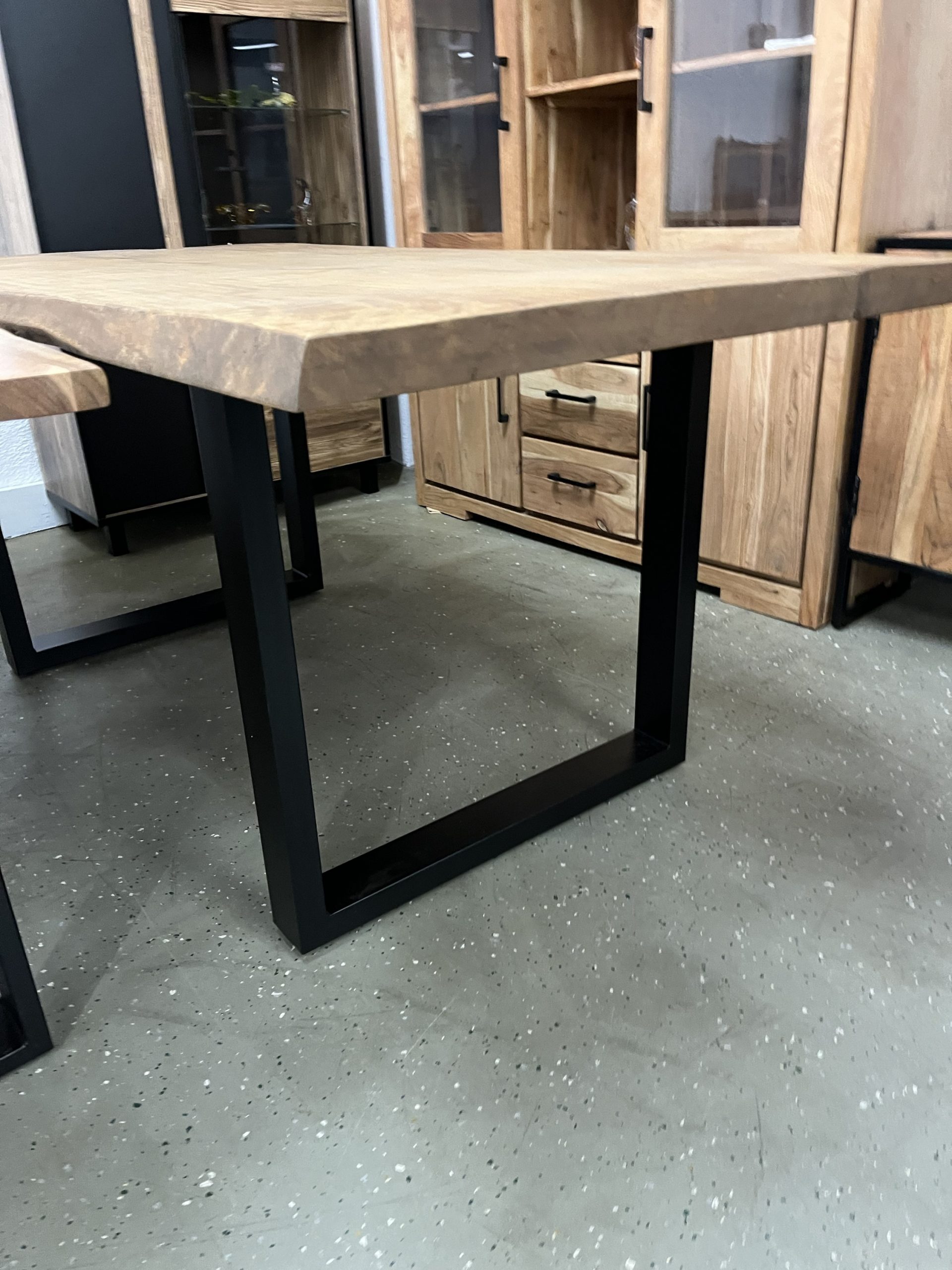Ein hochwertiger Esstisch aus vollmassivem Holz mit natürlicher Baumkante für einen einzigartigen, organischen Look. Die Oberfläche ist farblos geölt, wodurch die natürliche Maserung und Struktur des Holzes perfekt zur Geltung kommen und gleichzeitig geschützt sind. Das robuste Gestell besteht aus pulverbeschichtetem Stahl in U-Profil-Form in elegantem Schwarz – modern, stabil und stilvoll. Größe: L/H/B 180x78x90 cm Platte 50 mm Stark ❗️ Äste und Risse geschlossen Oberfläche geschliffen und farblos geölt Gestell U Profil 2x 8 cm schwarz Service & Vorteile: • Parkplätze vorhanden • EC-Kartenzahlung möglich • Persönliche Beratung vor Ort • Günstiger Lieferservice Unsere Möbel bekommen Sie Sofort und ohne elend lange Wartezeit +++ AUF WUNSCH LIEFERN WIR AUCH +++