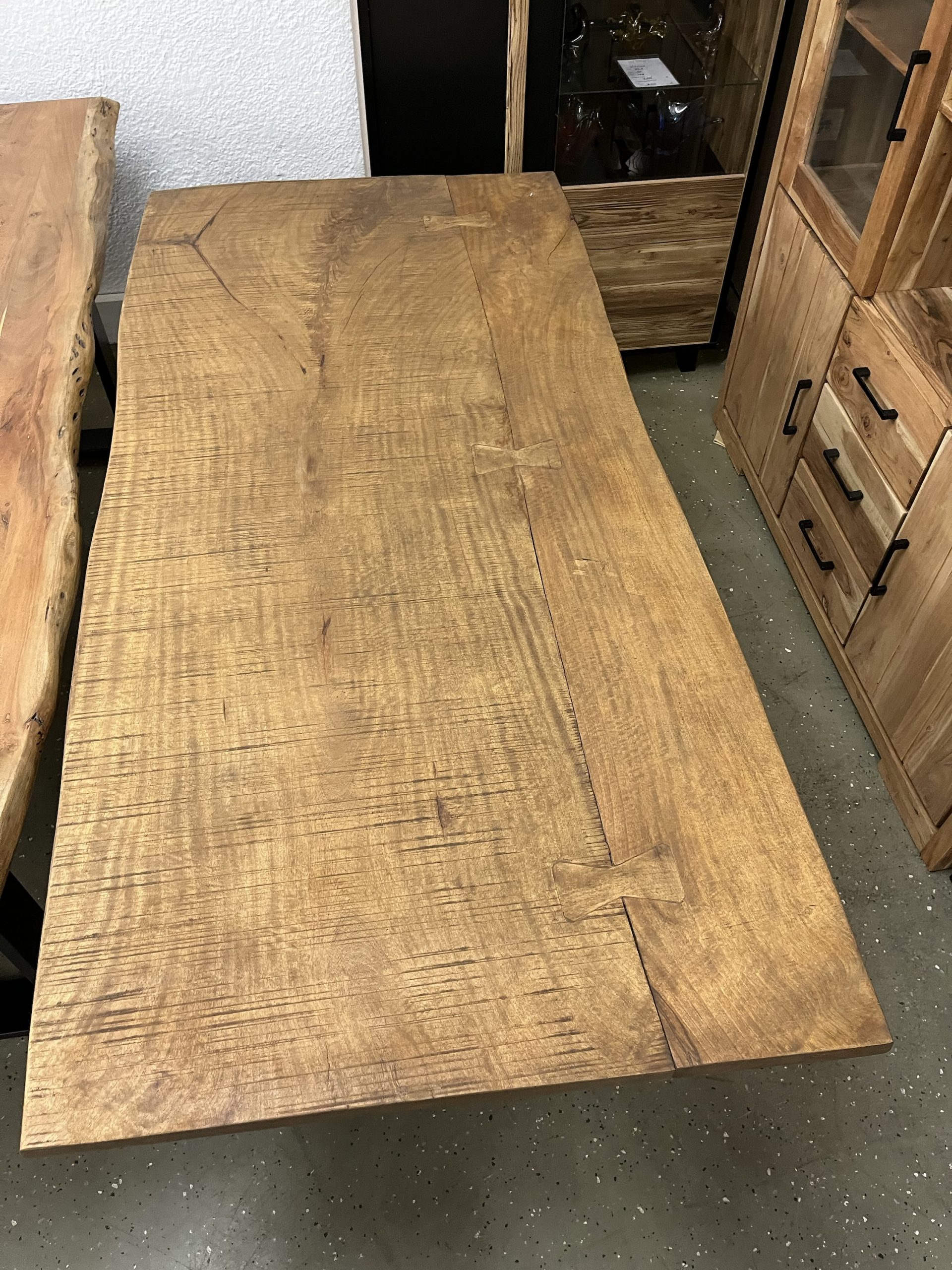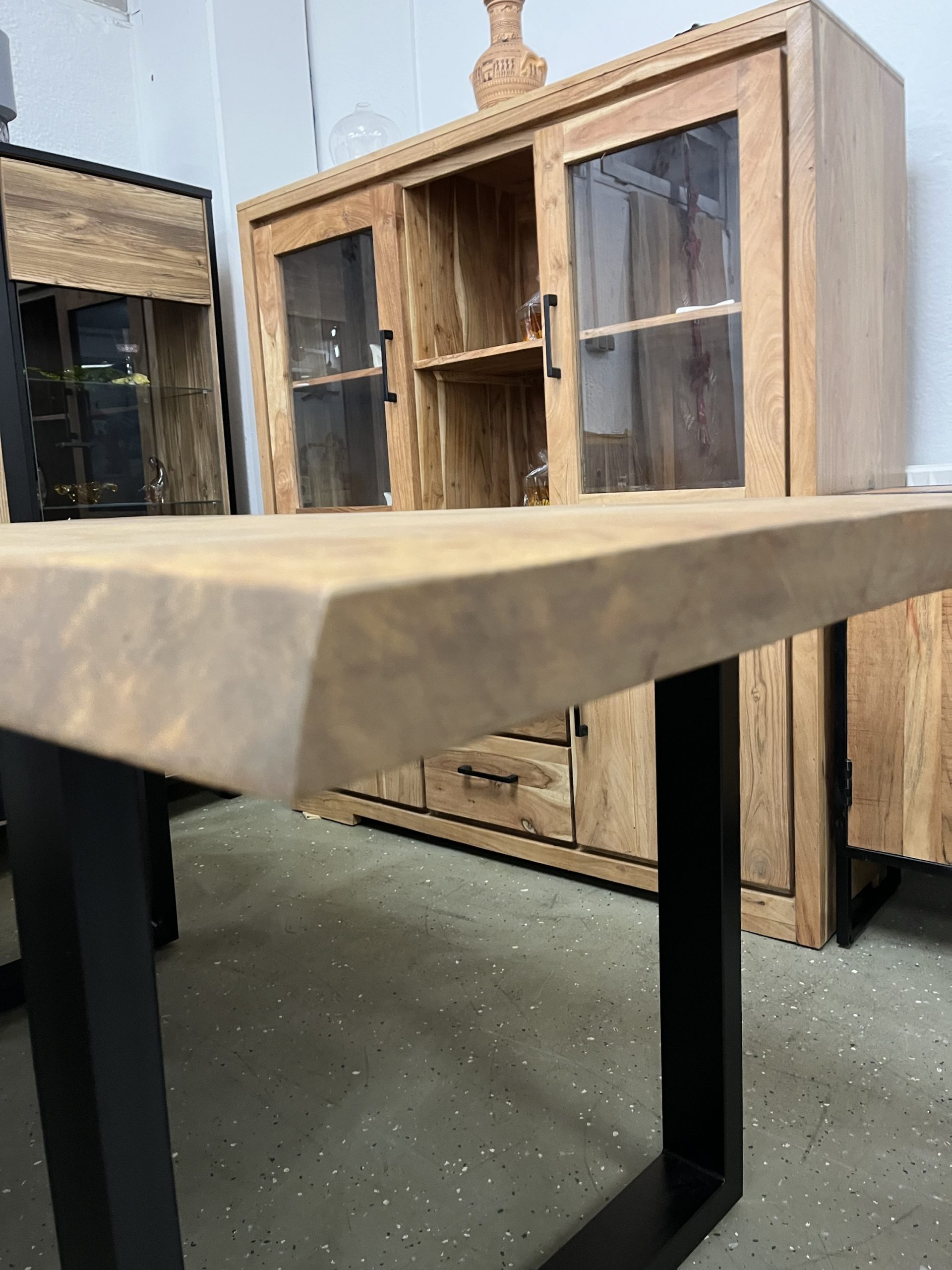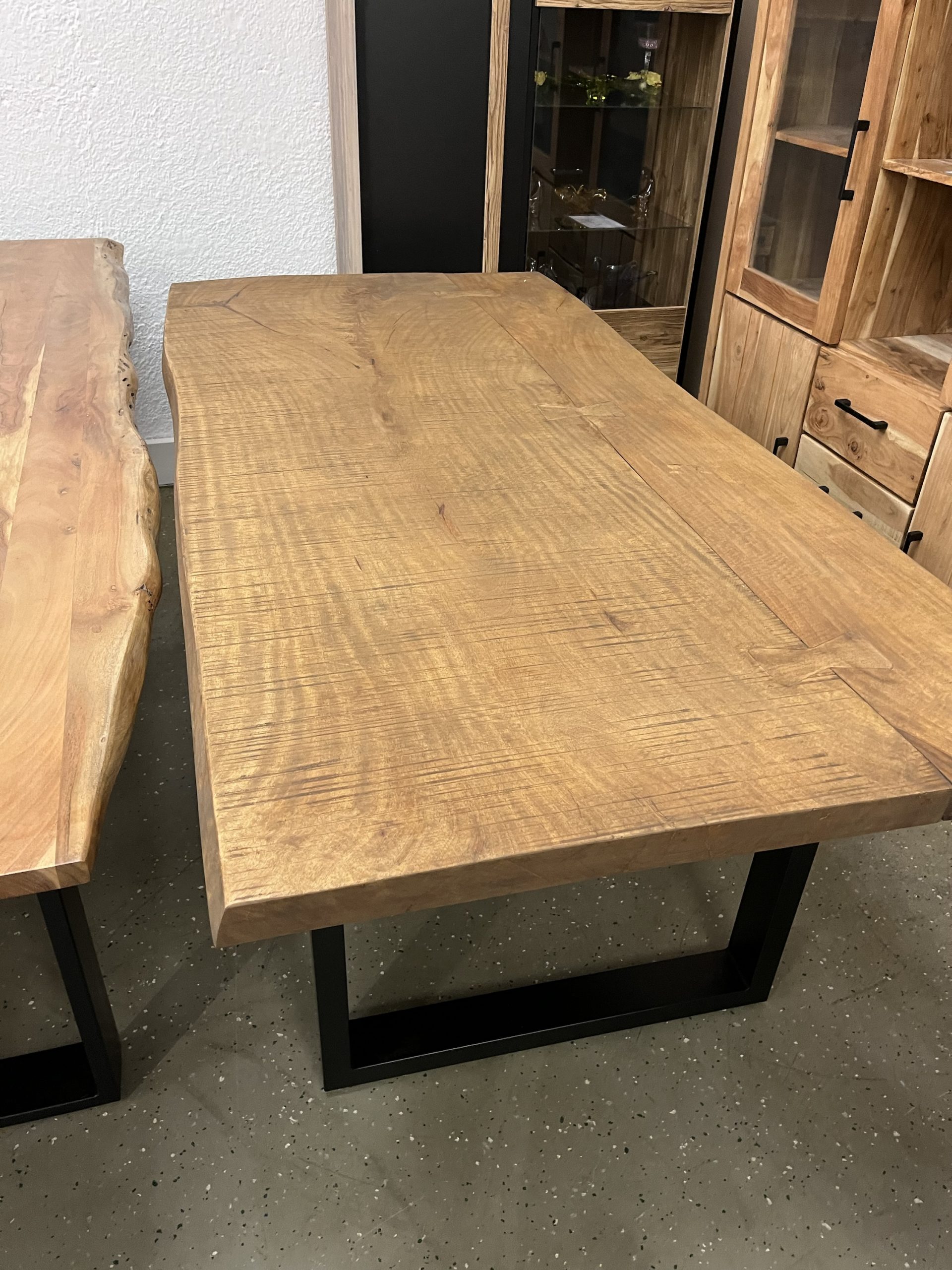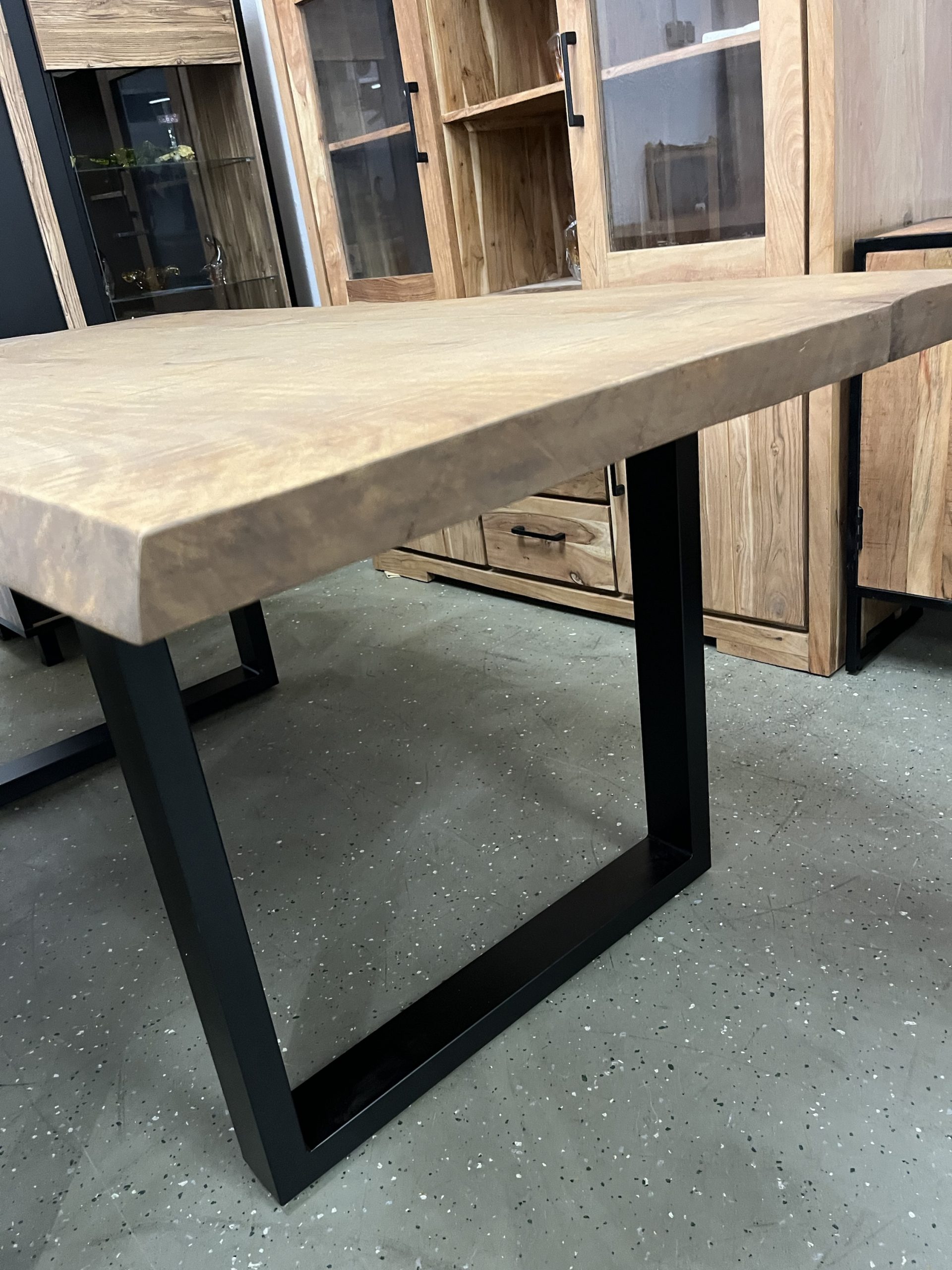 Ein hochwertiger Esstisch aus vollmassivem Holz mit natürlicher Baumkante für einen einzigartigen, organischen Look. Die Oberfläche ist farblos geölt, wodurch die natürliche Maserung und Struktur des Holzes perfekt zur Geltung kommen und gleichzeitig geschützt sind. Das robuste Gestell besteht aus pulverbeschichtetem Stahl in U-Profil-Form in elegantem Schwarz – modern, stabil und stilvoll. Größe: L/H/B 180x78x90 cm Platte 50 mm Stark ❗️ Äste und Risse geschlossen Oberfläche geschliffen und farblos geölt Gestell U Profil 2x 8 cm schwarz Service & Vorteile: • Parkplätze vorhanden • EC-Kartenzahlung möglich • Persönliche Beratung vor Ort • Günstiger Lieferservice Unsere Möbel bekommen Sie Sofort und ohne elend lange Wartezeit +++ AUF WUNSCH LIEFERN WIR AUCH +++